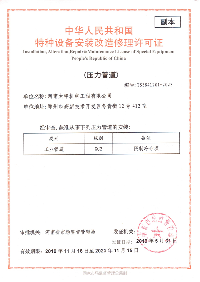 公司目前具有建筑機電安裝工程專業(yè)承包壹級、建筑工程施工總承包貳級、防水防腐保溫工程專業(yè)承包貳級、鋼結(jié)構(gòu)工程專業(yè)承包貳級、建筑裝修裝飾工程專業(yè)承包貳級、特種工程(結(jié)構(gòu)補強)專業(yè)承包不分等級、GC2壓力管道安裝改造維修資質(zhì)及設(shè)計資質(zhì),并通過了ISO9001質(zhì)量、環(huán)境、安全認(rèn)證及高新技術(shù)企業(yè)認(rèn)證,我們在不斷提升公司軟硬件實力的同時,先后與河南牧業(yè)經(jīng)濟學(xué)院、河南農(nóng)業(yè)大學(xué)等科研院所進行了深入的交流與合作,與比澤爾、漢鐘、萊富康、艾默生、約克、丹佛斯、寶豐等國內(nèi)外著名企業(yè)建立了長期穩(wěn)定的合作關(guān)系。