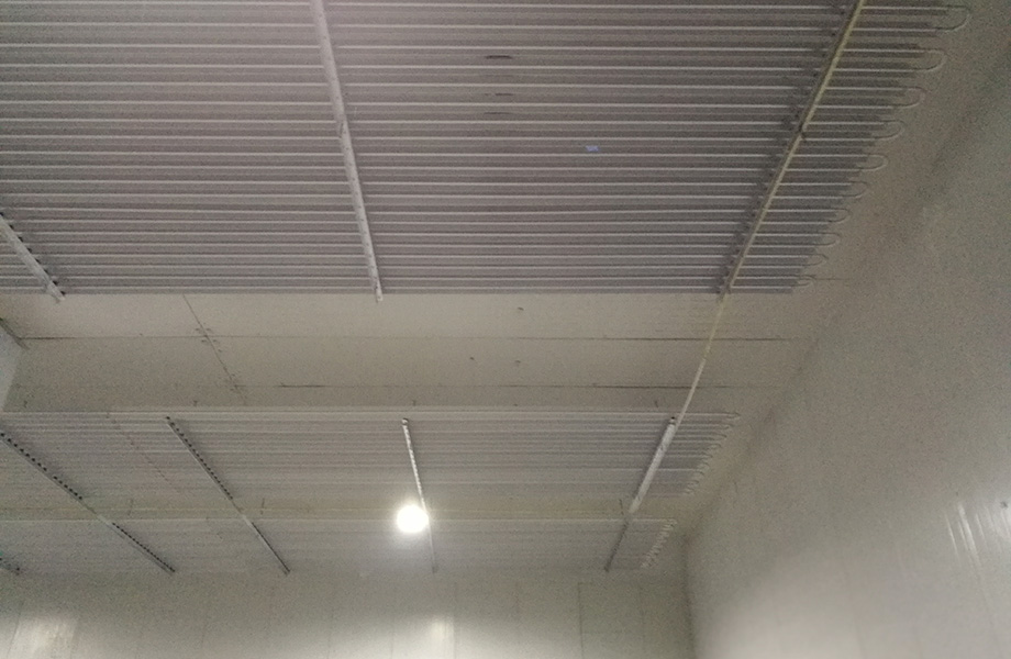 技術(shù)實現(xiàn)形式:制冷系統(tǒng)主機:選用一臺自帶經(jīng)濟器液氟冷卻螺桿并聯(lián)機組2*RC2-470,供液方式選擇:泵供液系統(tǒng)選用1臺桶泵機組ZWF6.0,循環(huán)桶容積6.0立方米,配置2臺屏蔽冷媒泵; 蒸發(fā)式冷凝器:制冷系統(tǒng)選用1臺SZL-1050蒸發(fā)式冷凝器,虹吸罐:系統(tǒng)選用1臺HG0.5,容積500L,用于冷卻冷凍機油。 冷間內(nèi)蒸發(fā)器的選擇選用水滴形兩翅鋁合金翅片管;沖霜方式:鋁排蒸發(fā)器采用手動熱氟融霜;
