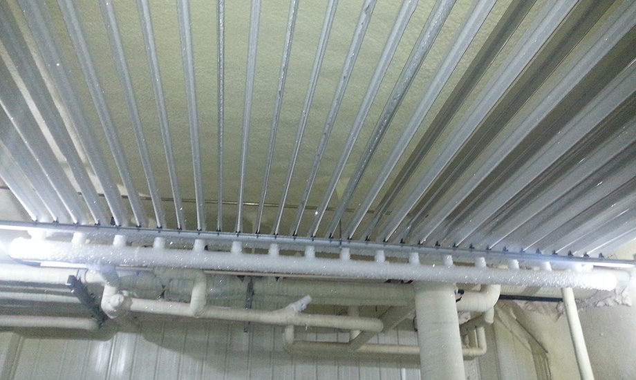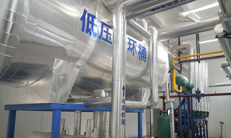 技術(shù)實(shí)現(xiàn)形式:制冷系統(tǒng)冷源采用1套滿液式高溫螺桿并聯(lián)制冷機(jī)組,壓縮機(jī)為德國比澤爾半封螺桿壓縮機(jī),制冷劑采用 R22, 機(jī)組配一臺(tái)蒸發(fā)式冷凝器,型號(hào)為:SPL-1165B,供液方式采用桶泵供液,末端蒸發(fā)器采用上下雙翅型鋁排管。
