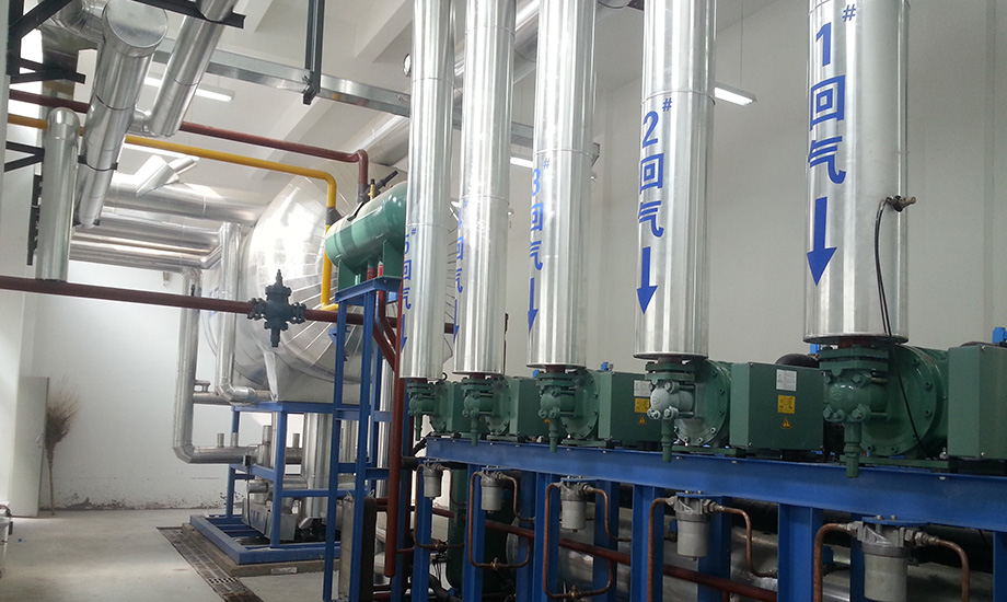 技術(shù)實(shí)現(xiàn)形式:制冷系統(tǒng)冷源采用1套滿液式高溫螺桿并聯(lián)制冷機(jī)組,壓縮機(jī)為德國比澤爾半封螺桿壓縮機(jī),制冷劑采用 R22, 機(jī)組配一臺(tái)蒸發(fā)式冷凝器,型號(hào)為:SPL-1165B,供液方式采用桶泵供液,末端蒸發(fā)器采用上下雙翅型鋁排管。